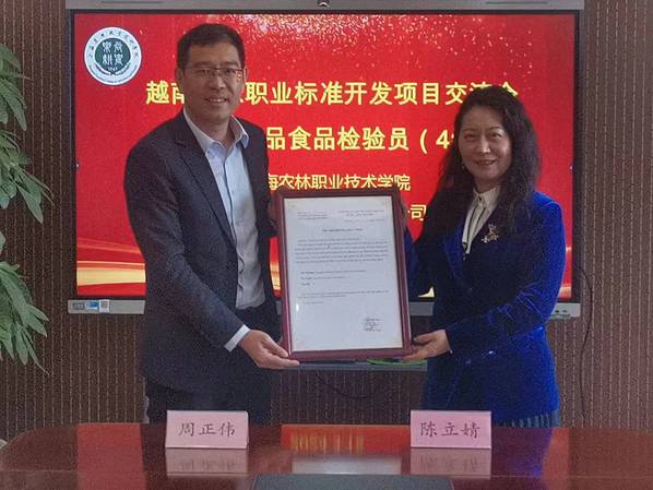 会上武汉叁壹教育科技有限公司周正伟为学院颁发了越南国家职业标准开发建设邀请函,并对接后期具体工作事宜。“越南国家职业标准开发项目”是针对越南国家重点行业职业技能岗位,优选中国同等职业标准,经本土化修订后,按越南国家相关流程注册认证,与配套专业教学标准一并纳入越南国家职业教育体系,指导越南国家职业院校开展人才培养工作。此次项目共有65个项目入选。我院入选农产品食品检验员4级职业标准的开发。