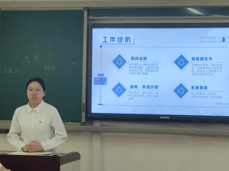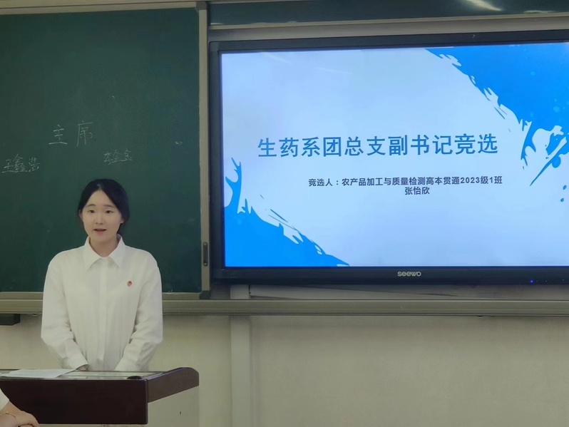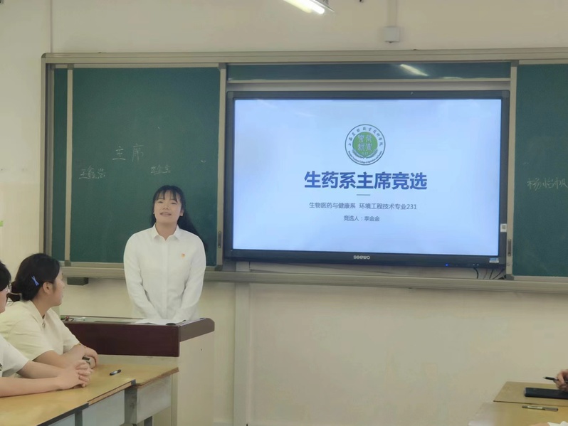 第二项议程是选举第三届生药系学生会主席团。根据会前的团支部推荐,系部讨论,从2023级学生中拟定了4名候选人,逐一进行竞聘发言,经全体代表投票表决,推选李金金,王鑫浩,张怡欣3名同学为生药系第三届主席团成员。生药系团总支书记齐雪飞表示:希望三名主席团成员以梦为马,不负韶华,在新的一年里带领同学们共同建设更有特色的生药系学生会。