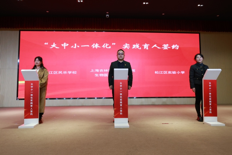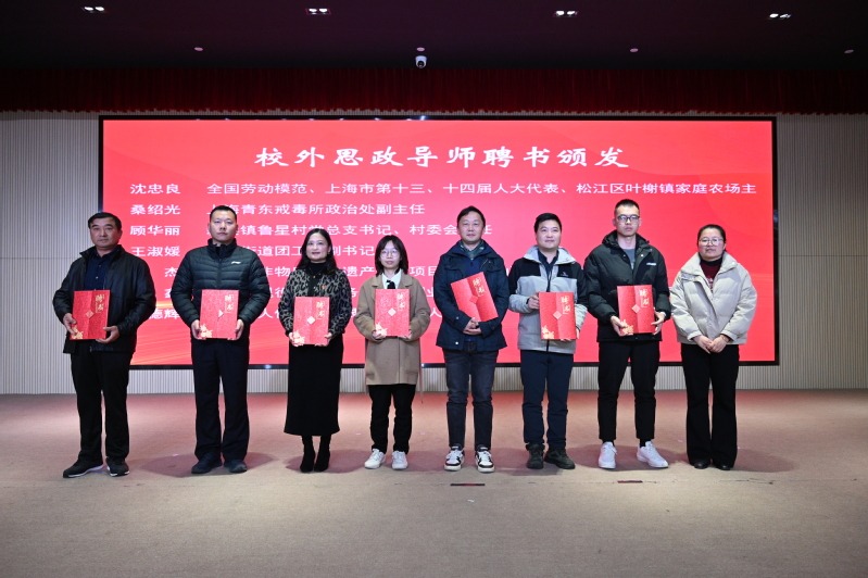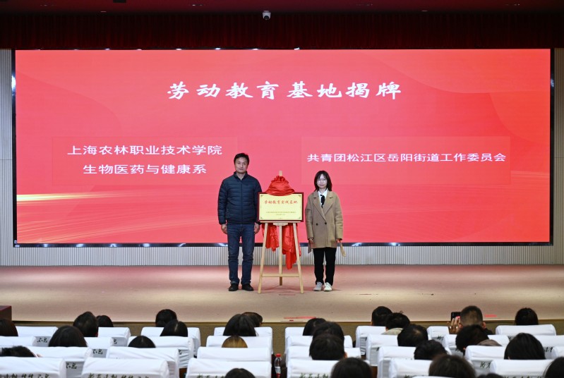 在第三篇章环节,生药系党总支副书记、副主任胡慧春与松江区民乐学校团委书记、学生发展处副主任兼大队辅导员宋璐璐、松江区实验小学德育教导汪竹君进行“大中小一体化”实践育人签约,探索“大中小一体化”实践育人新路径;生药系主任卢洪秀与岳阳街道团工委副书记王淑媛共同为生药系劳动教育实践基地揭牌,下一步将整合校地资源优势,搭建劳动教育实践平台,多元协同推进劳动育人工作;党委学工部部长高东菊为生药系校外思政导师颁发聘书,全国劳动模范沈忠良、上海青东戒毒所政治处副主任桑绍光、新浜镇鲁星村党总支书记、村委会主任顾华丽、岳阳街道团工委副书记王淑媛、上海市非物质文化遗产保护项目《新浜山歌》代表性传承人沈杰、上海市退役军人事务局就业创业导师、莜芈(上海)科技发展股份有限公司总经理詹鑫、上海鹿人佳科技有限公司创始人刘德辉受聘为生药系校外思政导师。导师代表沈忠良寄语同学们要热爱劳动、崇尚劳动、尊重劳动,在学习中深入钻研,勇于创新,为社会发展作出更多贡献。