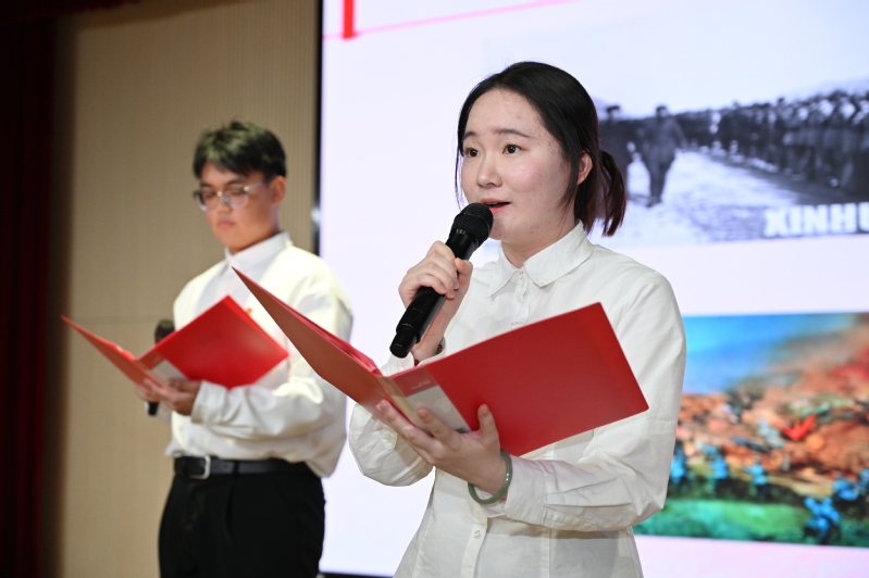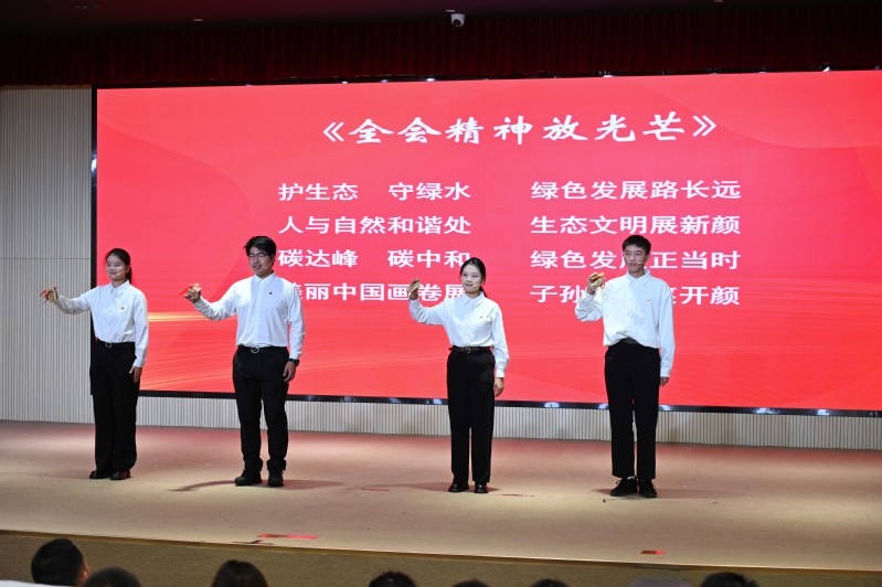 在第一篇章环节,由系部理论宣讲团张怡欣、王鑫浩和倪晨阳带来主题宣讲《给00后讲讲中国共产党》,教育引导广大学生在感悟中国共产党人精神谱系、体悟中华人民共和国成立75周年光辉历程中传承红色基因、赓续红色血脉;学院2024届毕业生、“小叶子讲师团”成员顾煜禛结合3年进博志愿服务经历,分享了学习习近平总书记对于进博会“三大定位”提出的新要求精神;关鑫、梁振晖、王涵雪和马琪燕4位同学带来原创快板《全会精神放光芒》,通过宣讲党的二十届三中全会精神,引领学生们深刻领悟党的创新理论的真理力量和实践伟力。