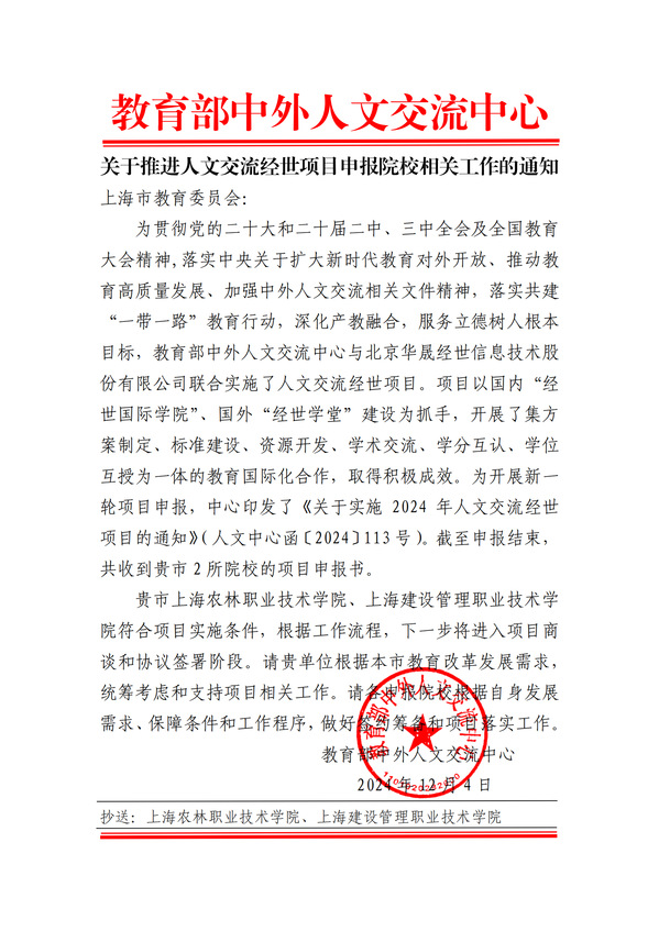 “人文交流经世项目”是由教育部中外人文交流中心联合北京华晟经世信息技术股份有限公司共同实施的国家级项目。该项目积极响应国家关于中外人文交流、教育对外开放和职业教育高质量发展的政策号召,旨在通过加强校企合作、促进产教融合,推动人文交流助力人才培养、学科专业建设和服务“一带一路”建设。“人文交流经世项目”已被教育部、财政部认定为“双高”建设国际化标志性成果。