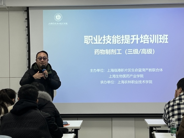 近日,上海临港新片区生命蓝湾产教联合体、上海生物医药产业学院主办,上海农林职业技术学院承办的药物制剂技术技能社会培训正式开班,这也是联合体首次在国家级医药产业人才培养基地开展技能人才培训。上海现代制药股份有限公司、复旦复华药业有限公司、上海凯宝药业有限公司、上海和黄药业有限公司等医药企业40余名学员参加。