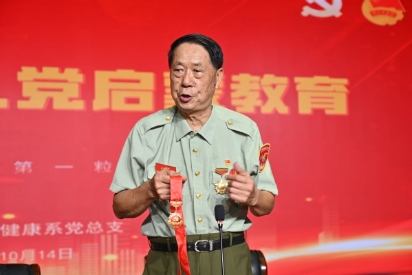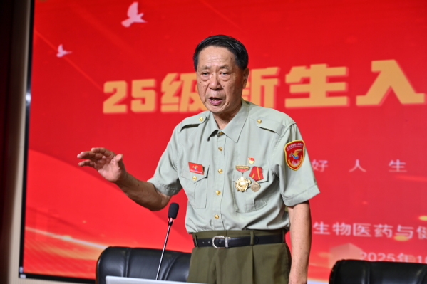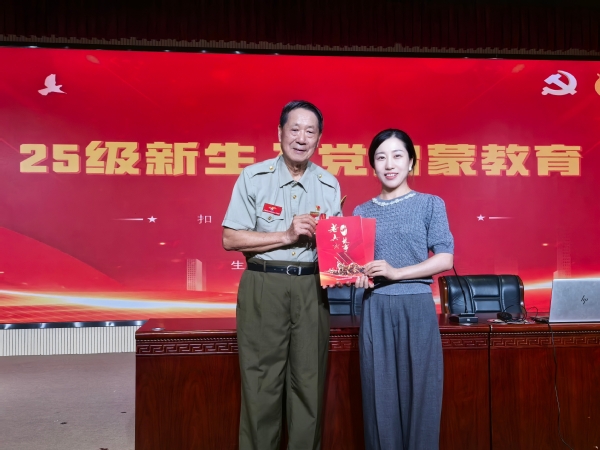 王一杰同志以《一生心向党,建功新时代》为主题,用亲身经历搭建起红色教育的桥梁。他结合战火纷飞年代的战斗记忆,深情讲述了自己在艰苦环境中坚守信仰、奋勇拼搏的经历,从硝烟弥漫的战场到和平时期的岗位坚守,每一段故事都饱含着对党的忠诚与热爱。朴实的语言、真挚的情感引发新生强烈共鸣,现场不时响起阵阵热烈掌声,成为对老党员崇高精神的由衷致敬。王一杰同志还代表松江区老兵讲故事宣讲团,向生药系赠送《老兵讲故事》一书,希望以红色书籍为载体,让新生在文字中感受老兵精神、传承红色基因。随后,杜孟静以《我心向党,不负韶华》为题,围绕“如何端正入党动机”,结合新生学习生活实际,从 “入党的初心是什么”“如何以行动向党组织靠拢” 等方面展开讲解,引导新生将个人理想与党的事业、国家发展紧密结合,明确在新时代背景下青年学子的责任与担当。