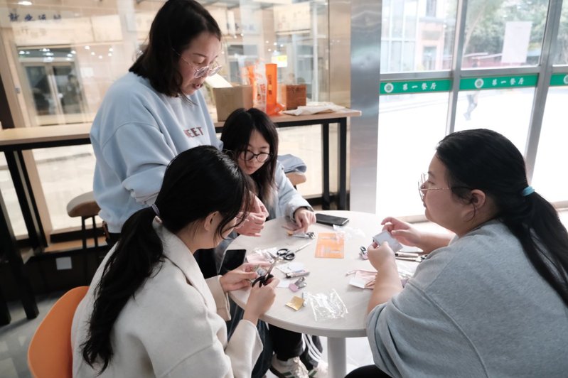 本次活动以中药手链制作与宋锦发夹DIY为核心体验项目,为同学们搭建了近距离感受非遗魅力的平台。活动现场,指导老师手把手指导同学们穿绳打结、裁剪组装,从山楂籽、菩提根等天然中药材的搭配,到“中国四大名锦”之一宋锦面料的纹样解读,每一个细节都融入了传统文化的深厚底蕴。同学们全神贯注投入创作,或相互交流技巧,或向老师请教难题,原本看似复杂的手作工序,在老师的耐心指导下变得简单易懂,活动不仅让同学们切实感受了中药文化的古朴韵味与宋锦工艺的美学价值,更在潜移默化中提升了审美素养与动手能力。