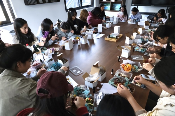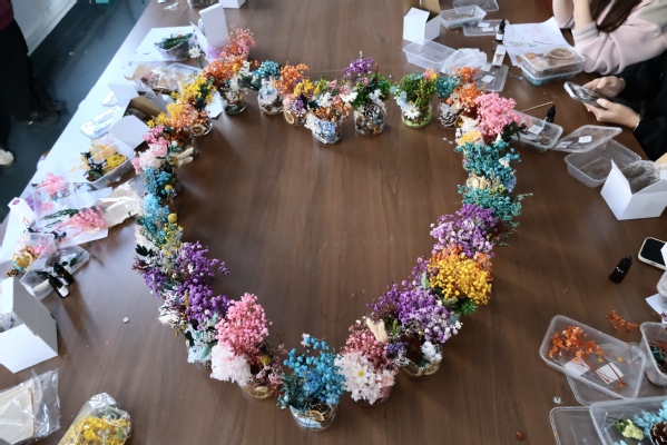香薰手作环节成为活动的另一大亮点。主持人详细演示了无火香薰的制作步骤与安全注意事项,同学们自主挑选水晶石、满天星、尤加利等干花素材,搭配柑橘、薰衣草、白茶等舒缓香型精油,亲手打造专属疗愈香氛。大家专注于素材搭配与创作细节,在动手实践中沉浸身心,现场弥漫着自然清新的香气。参与同学纷纷表示,手工创作的专注过程令人放松,成品香薰不仅颜值颇高,更能帮助改善睡眠、缓解压力,是一次实用又治愈的体验。