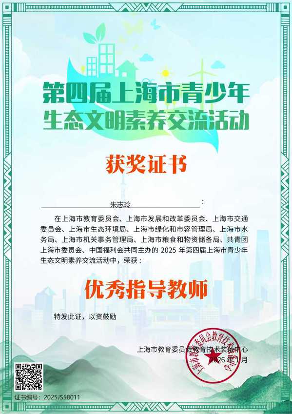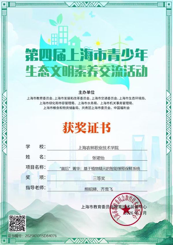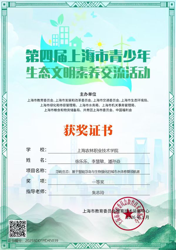 近日,由上海市教育委员会、上海市发展和改革委员会、上海市交通委员会、上海市生态环境局、上海市绿化和市容管理局、上海市水务局、上海市机关事务管理局、上海市粮食和物资储备局、共青团上海市委员会、中国福利会共同主办的2025年第四届上海市青少年生态文明素养交流活动结果揭晓,我系师生凭借扎实的专业功底与创新的实践成果,在全市参赛队伍中脱颖而出,共斩获一等奖1项、三等奖1项、优胜奖1项,1名教师荣获“优秀指导教师”称号,实现了赛事成绩的新突破。